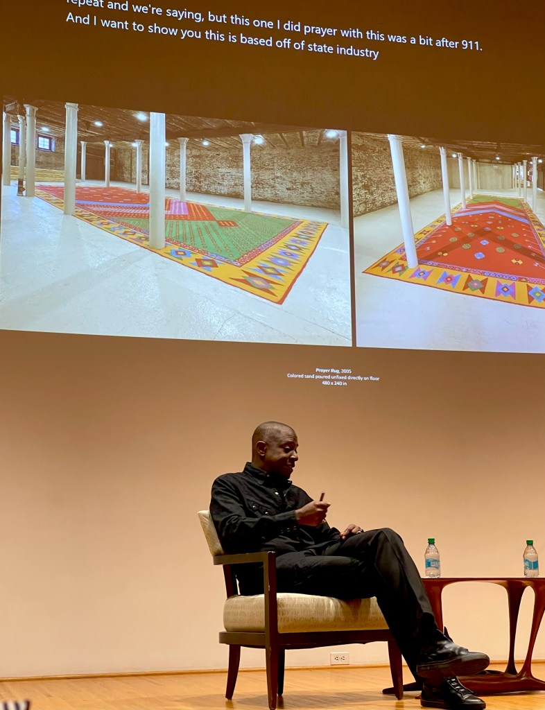 I enjoyed seeing the breadth of color, design, and ingenuity in Biggers’ “Prayer Rug” (below). In the wake of post 9/11 fervor, Biggers, using Afghan motfis and patterns, created this piece with his team by pouring sand directly on the floor (unfixed). It was not lost on us that one bad sneeze would have offset this entire endeavor. One can see that the sand was carefully poured around the pillars, making use of the room as players in the artwork, and the rug is somewhat angled. Is this to reflect how prayer rugs are directed to face Mecca?